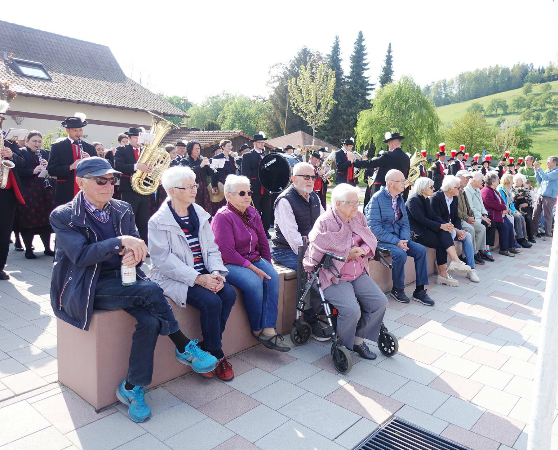 In seiner Kurzpredigt erinnerte Pfarrer Michael Toball von der Evangelischen Kirche an die biblische Weisung, im Glauben an den einen Gott gerade hier ein Miteinander in friedlicher Toleranz zu praktizieren. Er betonte, dass diese Ortsmitte tatsächlich ein Mittelpunkt gemeinsamen Lebens in Zeiten gesellschaftlicher Spaltungen werden könne; ein Platz, der einlädt, nicht nur vorbeizufahren, sondern anzuhalten und innezuhalten, unter Mai- und Christbaum das Leben zu feiern. Zwar sei es nicht ganz der Petersplatz in Rom (Idee von Hans-Peter Wagner), aber seine Geschichte als Vorplatz von Spital, Schule und Rathaus weise auf zentrale Fragen gesellschaftlichen Zusammenlebens hin. Gemeinsam mit Pfarrer Bonaventura Gerner, der in den Fürbitten der Menschen in der Ukraine gedachte und Gott um seinen Segen bat, segneten die beiden Priester neben dem Platz auch die Menschen auf dem Rat hausplatz.