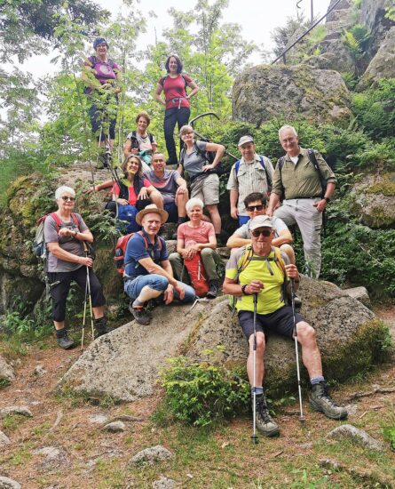Bevor es los ging, begrüßte der Wanderführer Klaus Pfundstein alle Wanderer im Hornberg und gab einen kurzen Überblick über den Verlauf der Tour. Schon kurz nach dem Start gab es das erste Highlight, die imposante Ruine der im 12. Jahrhundert errichteten Burg Hornberg. Der noch gut erhaltene Bergfried und die Aussicht in den Ort mit seinem Bahnviadukt sowie ins Gutach-Tal beeindruckte alle. Steil und schweißtreibend war der Aufstieg zur Schloss-Schanze, eine der vielen Schanzen in der Gegend, welche die Feinde im Angriffsfall aufhalten sollten. Weiter aufwärts führte die Route über einen schönen Pfad vorbei am Uhufelsen zum Ziegelkopf. Unterwegs gab es vom Wanderführer immer wieder fachmännische Antworten auf die vielen Fragen zu den Baumarten und den Herausforderungen, welche der Klimawandel mit sich bringt. Auf Waldwegen ging es zum Offenbacher Eckle, wo eine kurze Rast eingelegt wurde. Der folgende Streckenabschnitt war nicht mehr so steil und alle freuten sich auf die Einkehr im Restaurant »Schöne Aussicht«. Nach der ausgiebigen Pause ging es noch einmal aufwärts zum fast 1.000 m hoch gelegenen Karlstein, wo früher die Länder Baden und Württemberg sowie die Fürstenbergischen und Vorderösterreicherischen Besitzungen aneinander trafen. Außerdem gab es hier einen herrlichen Rundumblick über die Schwarzwaldberge. Jetzt wurde ohne nennenswerte Pausen abwechselnd über Waldwege und den schönen Fünfgeldpfad zum Parkplatz zurückgewandert. 13,5 Kilometer und 660 Höhenmeter waren geschafft.