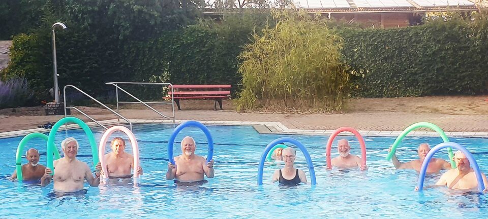 Für die letzte Übungsstunde vor den Sommerferien waren 34 Grad Celsius angekündigt. Petra Schneider, die TVU Senioren 60+, machte daher den Vorschlag, sich im Schwimmbad Oberharmersbach zu treffen. Mit den vom Bademeister ausgegebenen »Aqua-Nudeln« trainierte sie »ihre Männer« fast eine Stunde bei angenehmen 24 Grad Celsius Wassertemperatur. Alle Beteiligten waren begeis tert und freuen sich schon auf eine Wiederholung nach der Sommerpause.