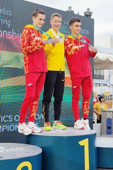 Mit fast zwei Minuten Vorsprung wurde Lukas Ehrle (LG Brandenkopf, Mitte) zum ersten Junior-Europameister im Off-Road-Running. Er teil sich das Treppchen mit den Silber- und Bronzeme daillen-Gewinnern aus Spanien. Foto: Kurt König