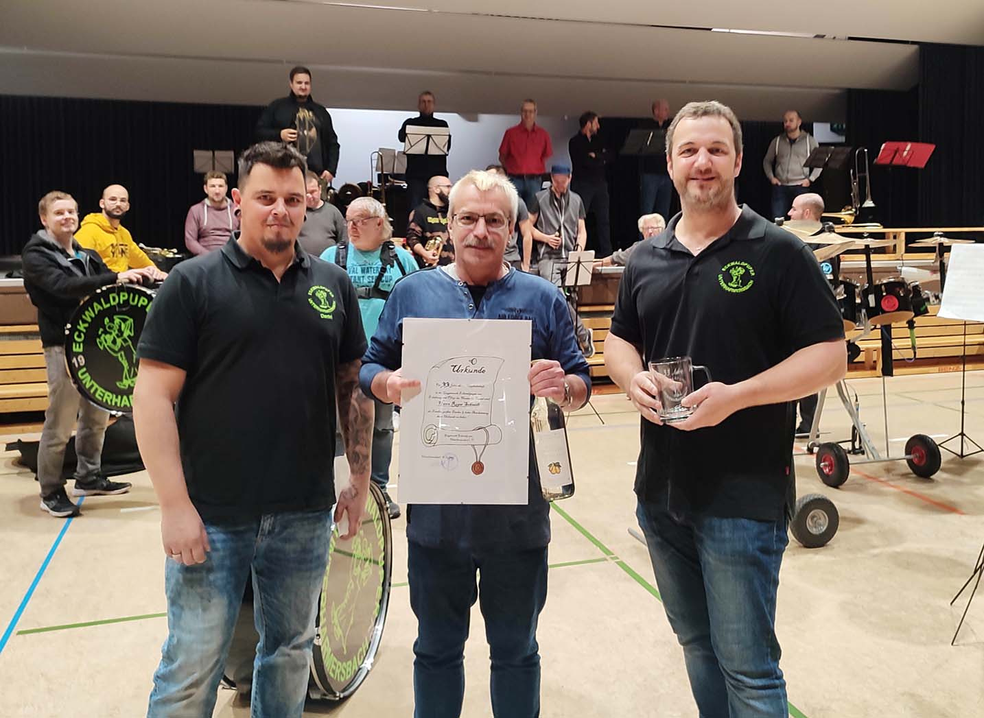 Da der Jubilar bei der Mitgliederversammlung verhindert war, wurde die Ehrung im Rahmen der Musikprobe nachgeholt. Die Vorstandschaft bedankte sich von Herzen bei ihrem großartigen Sousaphon-Spieler und stieß gemeinsam mit den Mitgliedern und Roger auf die nächs ten 33 Jahre im Verein an. Im Rahmen der Ehrung wurde eine Urkunde, ein graviertes Bierglas sowie eine Flasche feinstem »Williams Christ« überreicht.