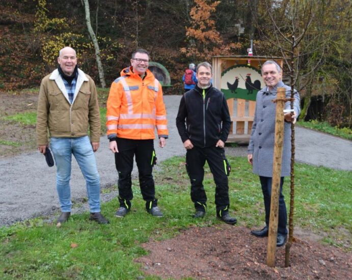 »Wir haben umgesetzt, was versprochen wurde«, erläuterte Betriebshofleiter Matthias Fritsch die letzte der Maßnahmen für die Neugestaltung des Wanderparkplatzes. Die Streuobstwiese angrenzend zum Wohngebiet wurde mit 21 Obstbäumen bepflanzt. Dafür wurden alte Sorten gewählt. Auf dem Gelände wachsen nun Apfel-, Kirsch- und Birnbäume sowie ein Speierling. Die Früchte, die hier in Zukunft reifen, können von Wanderern oder Tieren »geerntet« werden.