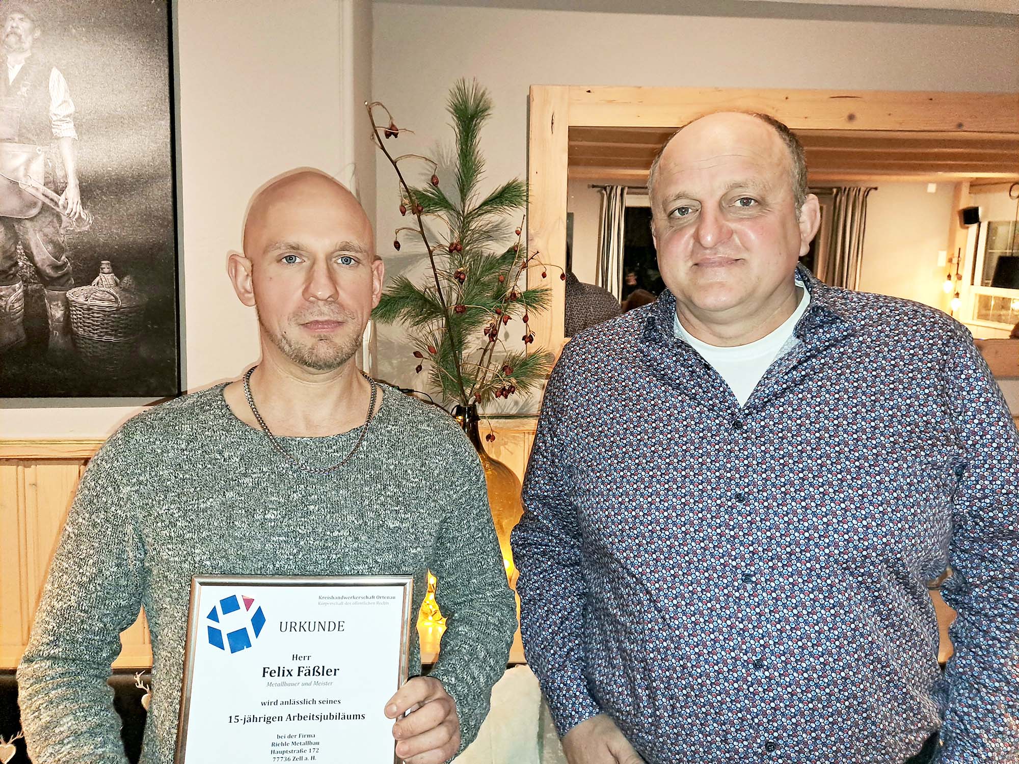 Im Rahmen der diesjährigen Weihnachtsfeier ehrte Xaver Riehle seinen Mitarbeiter und Meister Felix Fäßler für 15 Jahre Betriebszugehörigkeit.