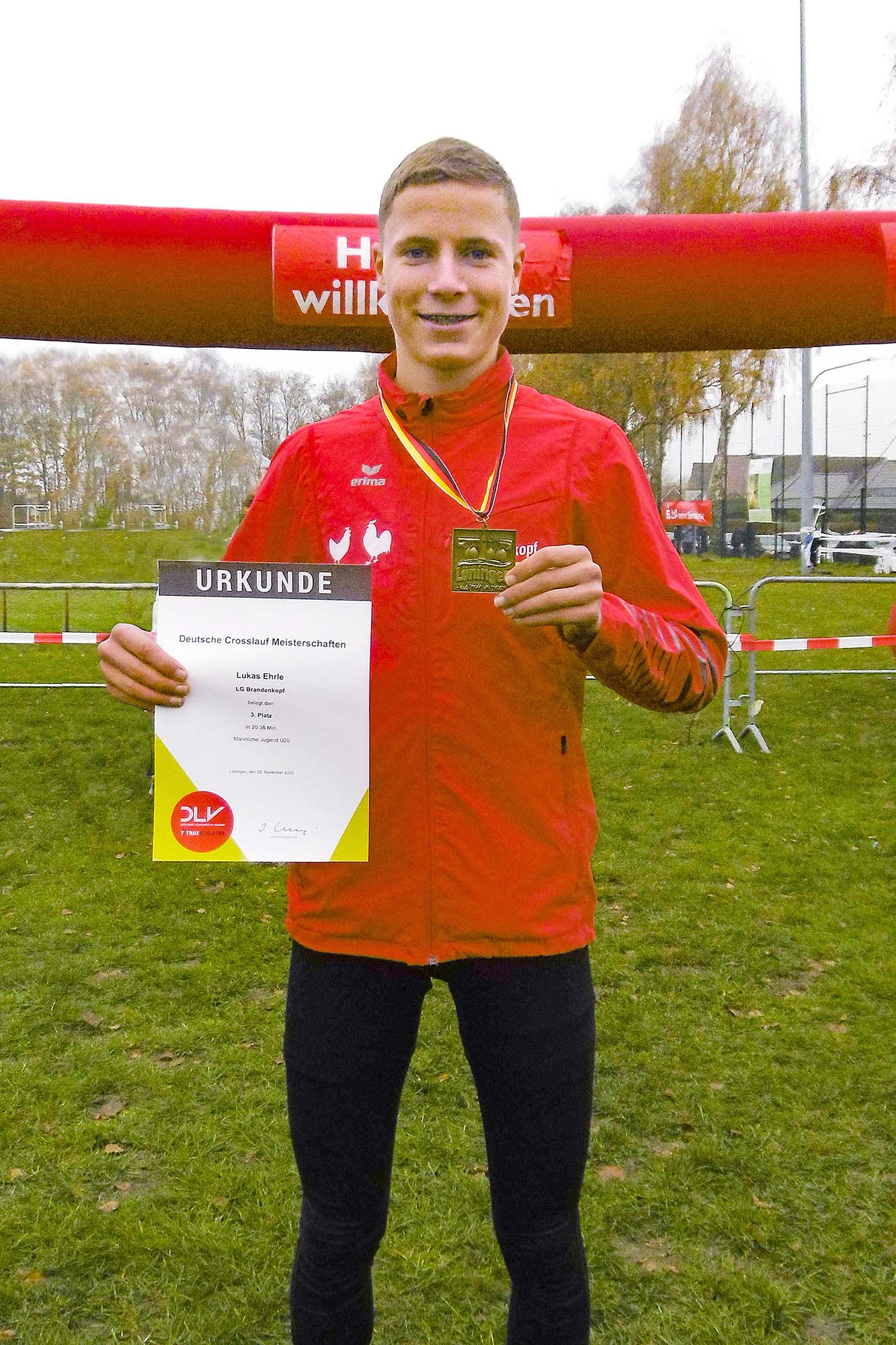 Stolz präsentiert Lukas Ehrle die Siegerurkunde und die Bronze-Medaille, die er bei der Crosslauf-DM errungen hat. Foto: privat