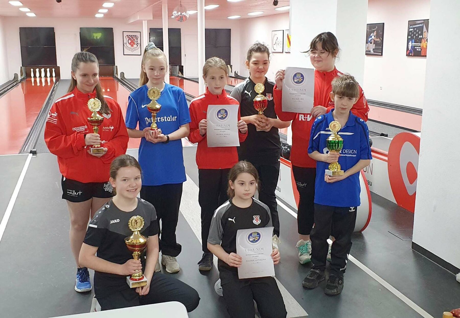 Die Keglerjugend hatte ihren Vorlauf in Goldscheuer. Bei der U10 Disziplin werden die 120 Wurf komplett in die Vollen gespielt, hier wurden Samantha Alexander vom SKC Unterharmersbach mit 1.169 Kegel und Lian Barbanes (KSC Önsbach) mit 1.153 Kegel konkurrenzlos Sieger.
