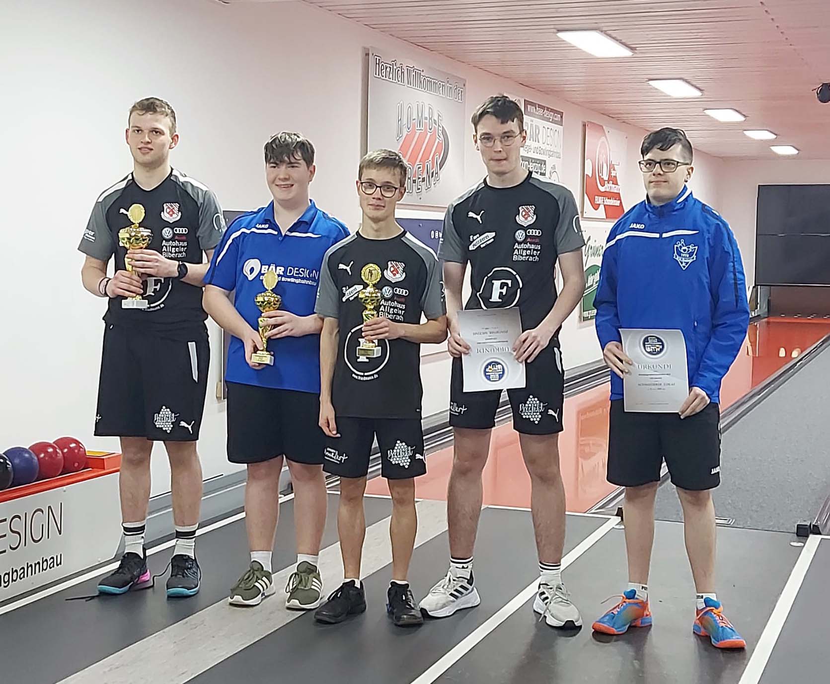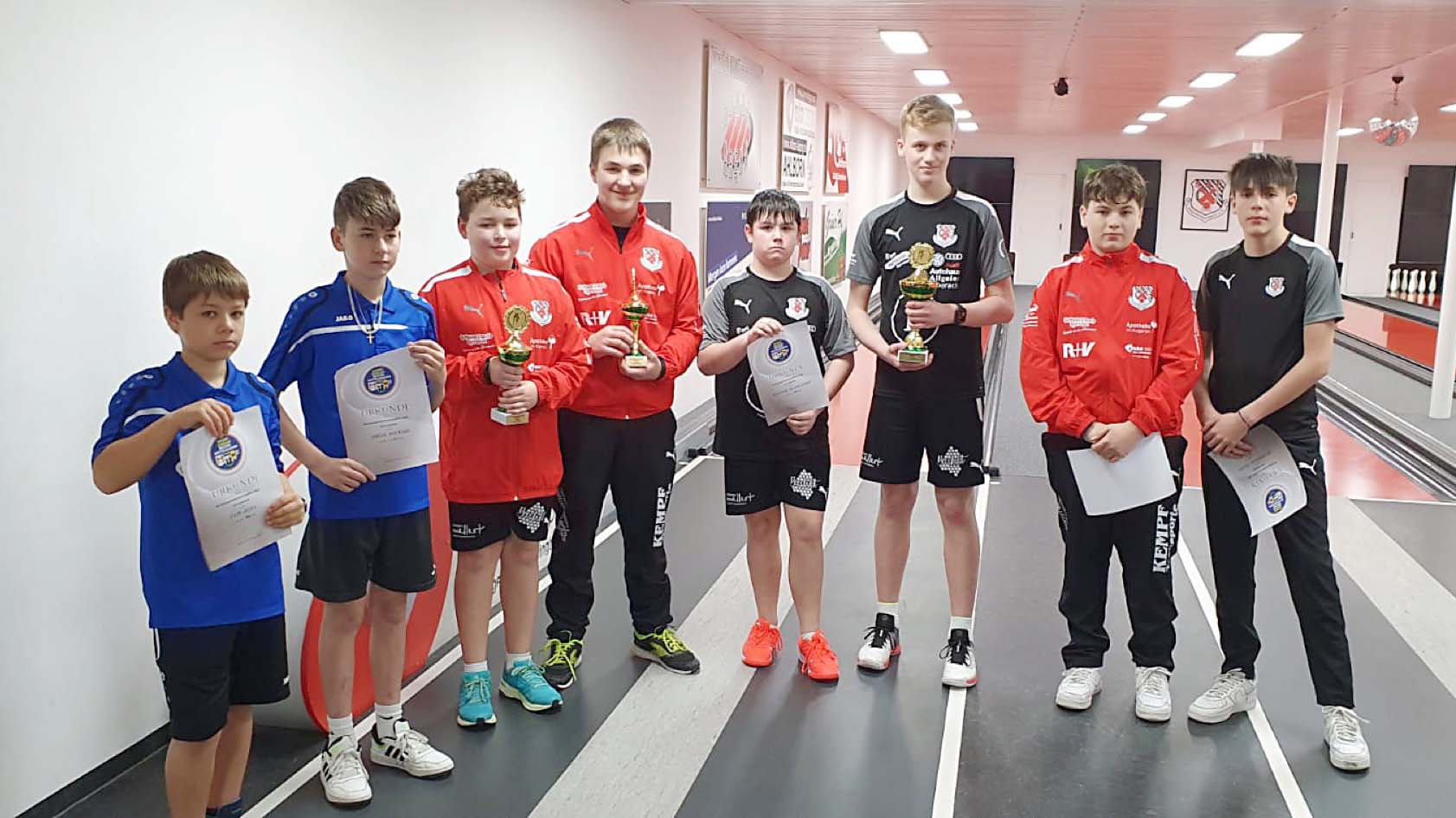 Bei den U14 Jungs gingen gleich die ersten vier Plätze ins Harmersbachtal. Sieger wurde Paul Schondelmaier mit 1.058 Kegel, John Alexander erspielte sich mit überragenden 575 Kegel eine neue Bestleistung und kletterte so mit 1.041 Kegel noch vom vierten auf den zweiten Platz. Den dritten Platz sicherte sich Matheo Boschert knapp mit 955 Kegel. Denn Franz Josef Wacker war mit 950 Kegel nicht weit weg. Julius Spitzmüller belegte mit 822 Kegel Platz 7 und Jan Leon Dittrich mit 711 Kegel Platz 8.