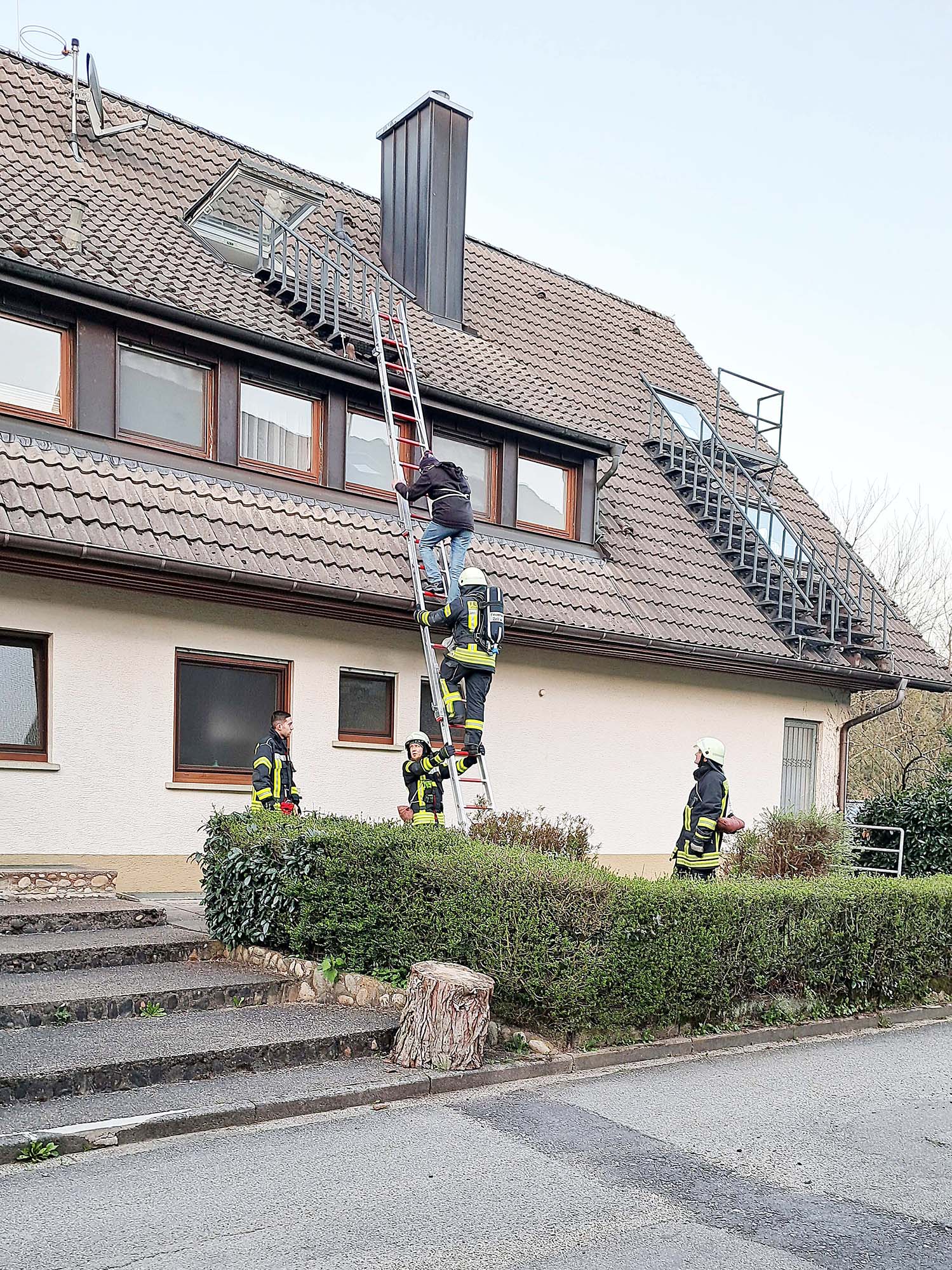 Da der vermeintliche Rauch von der Garage durch das Treppenhaus innen hoch bis in die oberste Etage zog, musste ein Bewohner über das Dachfenster und die darunter befindlichen Rettungsstufen mit der Leiter »gerettet« werden. Der Einsatz funktionierte vorbildlich.