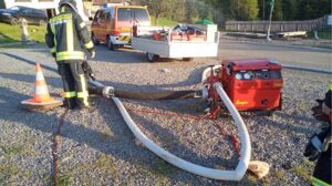 Dann begannen die eigentlichen Löscharbeiten. Weitere Einsatzkräfte trafen an der Einsatzstelle ein. Alles musste koordiniert werden. Es galt: Das Feuer darf nicht auf das Wohngebäude übergreifen! Mit den 1.100 Litern Wasser, die auf dem Löschgruppenfahrzeug mitgebracht wurden, wäre der angenommene Brand nicht zu löschen gewesen. Zum Glück gab es auf der Talseite einen erst im letzten Jahr errichteten Löschwassertank mit 100.000 Litern Wasser. Das gab Sicherheit und ausreichend Wasser zum Löschen des Scheunenbrandes. Im Ernstfall wären auch noch weitere wasserführende Fahrzeuge am Einsatzort eingetroffen. Im Anschluss an die Löscharbeiten, wurde die Scheune noch mit einem Hochdrucklüfter belüftet, um den Rauch zu entfernen.