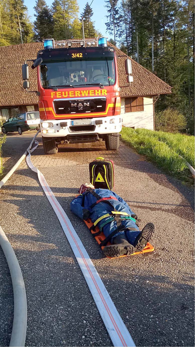 Nach einer Anfahrt mit dem Löschfahrzeug von fast sechs Kilometern und der Überwindung von rund 500 Höhenmetern wurde zunächst die simulierte Lage vor Ort erkundet. Das Szenario: Im Bereich der Scheune, die an das Wohnhaus angrenzt, schlugen die Flammen bereits durch das Dach. Sofort wurden die Bewohner, welche im Hof standen, durch den Gruppenführer befragt. Gleichzeitig begann auch schon die Suche nach der vermissten Person, die sich laut Aussage der Bewohner in der Scheune aufgehalten haben soll. Der Angriffstrupp verschaffte sich unter Atemschutz Zugang zur verrauchten Scheune. Die Person war bald gefunden. Zum Glück handelte es sich nur um eine 80 Kilogramm schwere Übungspuppe.