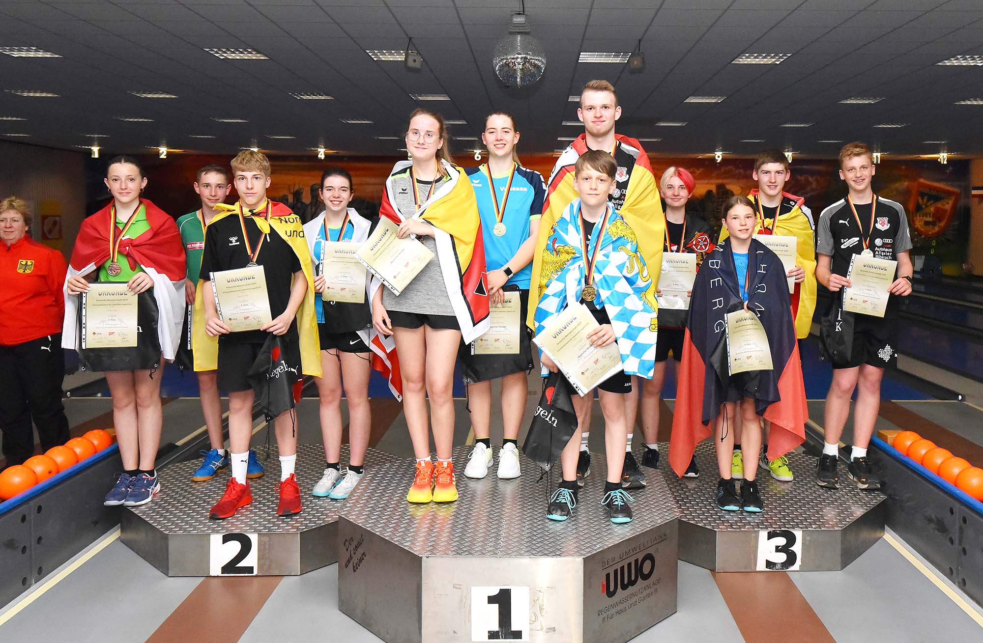 Bei den U14 Jungs war Unterharmersbach gleich viermal Vertreten. Hier war es zum Schluss etwas dramatisch. Alexander John erspielte 510 Kegel und verpasste mit dem 13. Platz knapp den Finallauf am Montag. Diesen erreichte dann wiederum mit 512 Kegel und dem 12. Platz Franz Josef Wacker wegen zwei Kegel mehr. Paul Schondelmaier kam mit 529 Kegel auf Platz 9. Im Finallauf holte dann Franz Josef Wacker mit 461 Kegel keinen Platz mehr auf. Doch der 12. Platz war ihm nicht mehr zu nehmen. Paul Schondelmaier zimmerte dann 564 Kegel zu 1093 Kegel auf die Bahn. Mit dem zweitbesten Finalergebnis schob er sich dann Platz um Platz hoch und schaffte mit der Bronzemedaille noch den Sprung aufs Treppchen. Überragender Auftritt von einem der Jüngsten. Felix Schmidt vom KV Bayreuth erzielte mit 597+601=1.198 Kegeln einen neuen Deutschen Rekord über 120 und 240 Wurf und wurde so überragend Deutscher Meister.