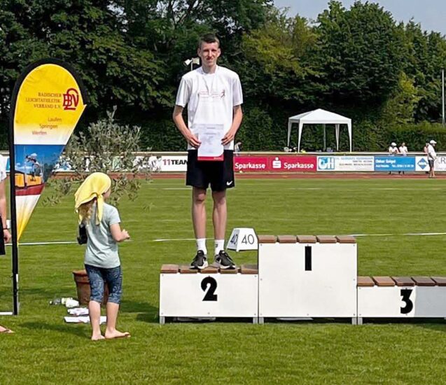 Im zweiten Lauf war nur ein Athlet schneller als er. Dies bedeutete den Gewinn der Badischen Vizemeisterschaft. Mit der gelaufenen Zeit qualifiziert er sich darüber hinaus für die Baden-Württembergischen Meisterschaften. Sie finden Anfang Juli in Weinstadt statt. Aron Roth (MU20) startete in Schutterwald über 800 Meter und belegte in neuer Bestzeit von 2:04,44 Minuten den siebten Platz.