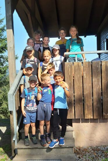 Nach einem kurzen Kennenlernen wanderten die froh gelaunten Kinder das Bachwegle entlang bis zum Strietparkplatz. Nach einer kurzen Stärkung führte die Wanderung weiter bergauf bis zur Kuhhornkopfhütte. Dort wurde die Gruppe von den Hüttenwirte mit Getränken versorgt.