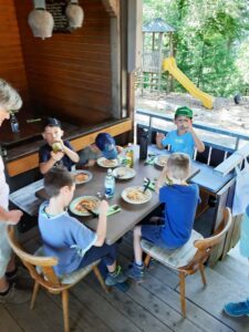 Nach einer kurzen Pause bastelten die Kinder bunte Fäden an die bei der Wanderung gesammelten Zapfen. Nun ging es zum ersten Spiel, ein Zapfen-Wurfspiel. Danach wurden die Kinder von den Hüttenwirte zum Mittagessen eingeladen. Gestärkt und wieder voller Elan wurden noch mehrere Spiele gemacht, wie z.B. Dosenwerfen, Eierlauf und Ballon-Paarlauf, die von den Betreuern vorbereitet wurden.