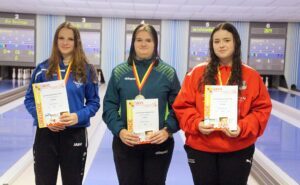 Aus Unterharmersbacher Sicht verlief es bei den U18 Mädels unglücklich, Celina Wacker (554 + 536 =1090 Kegel) und Leonie Fritsch (534 + 546 = 1080 Kegel) lagen nach dem Vorlauf in Führung. Im Finallauf holten dann aber Nathalie Gruber (531 + 565 =1096 Kegel) von der SKG 77 Singen und Julia Bräuer (528 + 565 =1093 Kegel) wieder auf und zogen am Ende mit drei beziehungsweise sechs Kegeln auf Platz 1 und 2 vorbei.