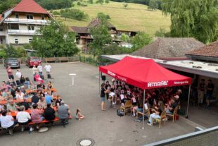 Dort angekommen führte die Wanderung vom Sportplatz über Waldwege und durch Reben zum Schützenhaus. Der Regenschirm war aufgrund der nassen Witterung ein treuer Begleiter.
