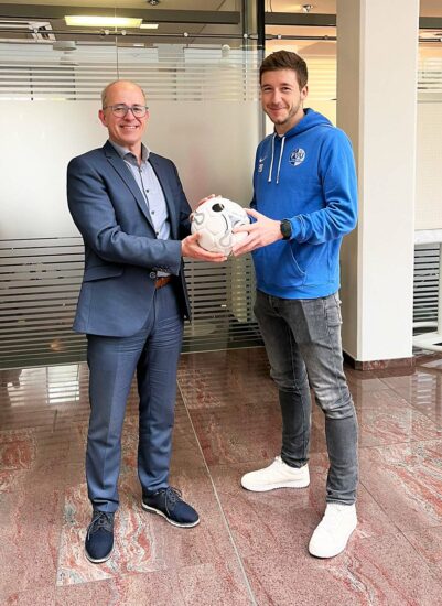 Den Spielball hat die Sparkasse Kinzigtal gespendet. „Wenn das mal kein gutes Omen ist“, sagt Jürgen Schmider (links), Marktdirektor des Beratungscenters Zell. Er hat den Spielball Mittelfeldspieler Christian Gieringer überreicht.