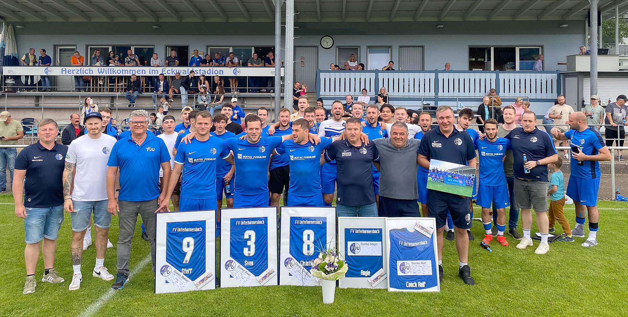 Verdienter Beifall von der Tribüne und den Mannschaftskameraden (von links): Florian Jilg, Philipp Lehmann und Jörg Leisinger vom FVU-Vorstand verabschiedeten die langjährigen Spieler Stefan Schwarz, Sven Bühler und Christian Hug sowie Angi Gutierrez, Rolf Geppert und Darius Sobieranski vom Trainerteam. Foto: FVU