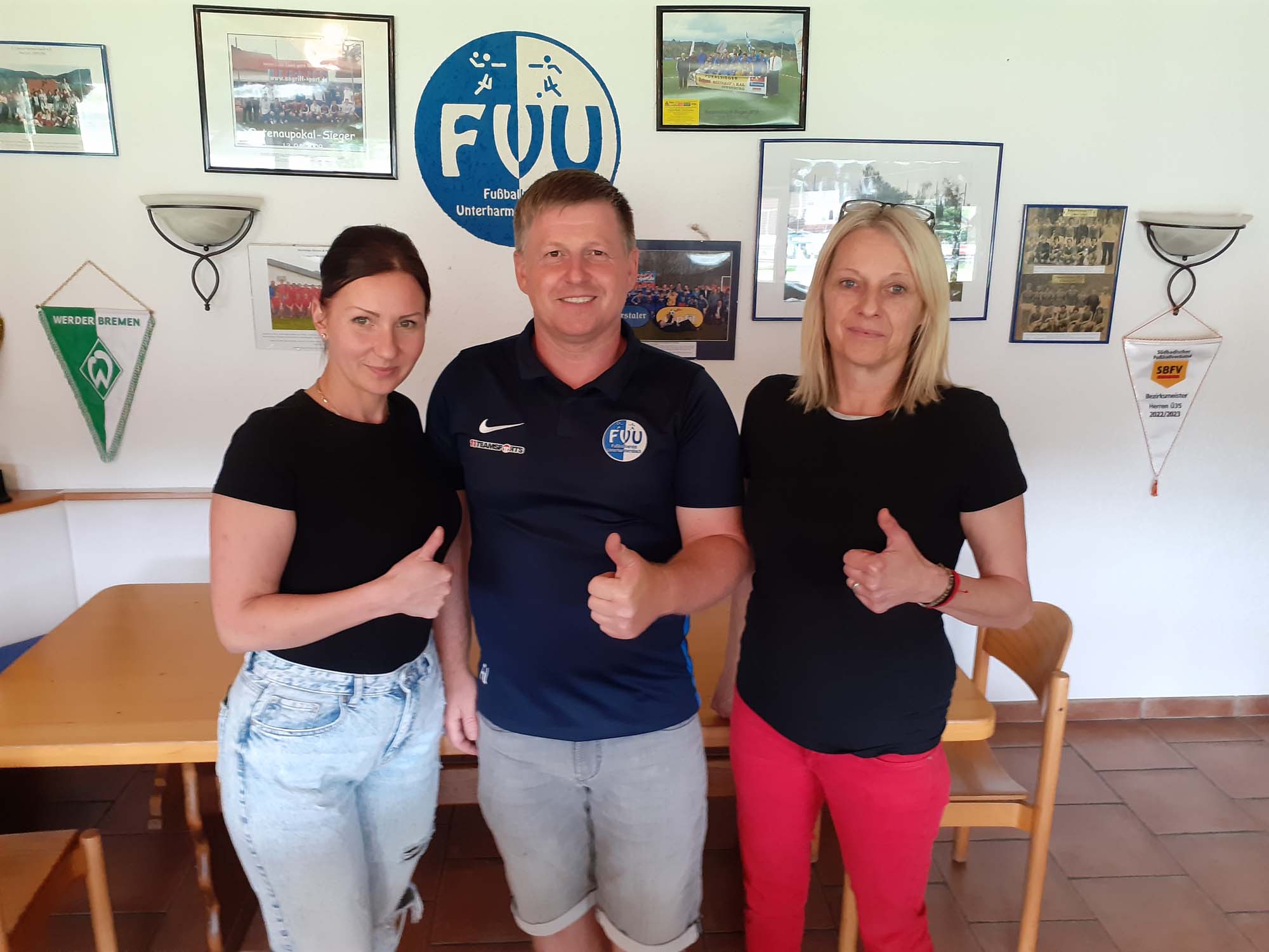 Daumen hoch: Florian Jilg und die beiden künftigen FVU-Clubheim-Wirtinnen Anna Bondar (links) und Monika Joos strahlen um die Wette. Foto: FVU
