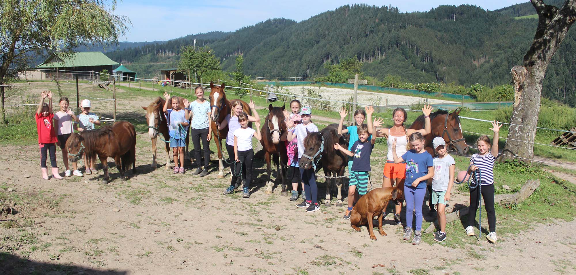 Nach einem kleinen Marsch bergauf vermittelte die Pferdehalterin am Reitstall grundlegendes Wissen über die verantwortungsvollen Aufgaben zur Pflege der Pferde, die artgerechte Haltung und wie richtig gefüttert wird. Mit großen Augen stellten die Kinder zahlreiche Fragen rund um diese beeindruckenden Tiere. Eine kleine Wanderung mit den Pferden und zwei Hunden rundete das Programm ab. Mit strahlenden Augen und dem Wunsch nach einem eigenen Pferd verabschiedeten sich die Kinder zum Ende des Programmes – tierisch gut!