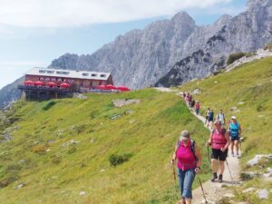 Die Aktivgruppe und die Erlebnisgruppe wanderten gemeinsam bis zum Ellmauer Steinkreis, einem energetischen Natur-Kraftfeld in Form eines riesigen Mandalas. Nachdem alle genügend Kraft getankt hatten, trennten sich die Wege. Die Aktivgruppe wanderte zu der höchsten Schutzhütte im Gebiet des Wilden Kaisers, der urigen Gruttenhütte. Sie liegt malerisch auf 1.620 m, auf der Südseite des Wilden Kaisers mit traumhaftem Ausblick. Die Hälfte der Gruppe genoss bei traumhaftem Wetter den Flair der Hütte, der Rest stieg noch 300m auf und gesellte sich dann auch zum Rest der Gruppe, bevor es über einen anspruchsvollen steinigen Weg zurück ging.
