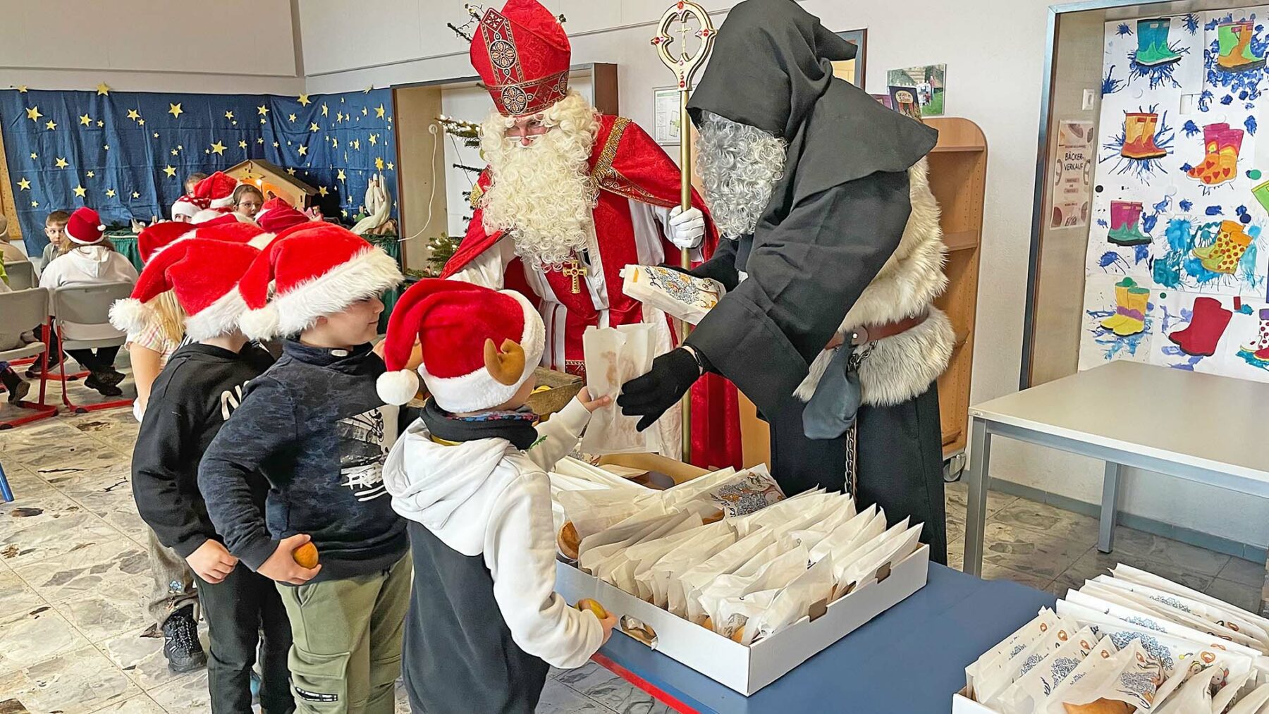 Nikolaus und Knecht Ruprecht sorgten am Nikolaustag an der Grundschule Unterharmersbach für Aufregung.