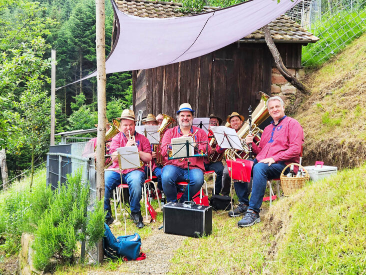 Bei Wurstsalat, Flammkuchen, selbstgebackenem Kuchen und Holunderblütenschorle genießen die Gäste handgemachte Musik und eine fantastische Aussicht ins Tal. Die „Saumusik“ und Familie Lehmann freuen sich auf viele Besucher.