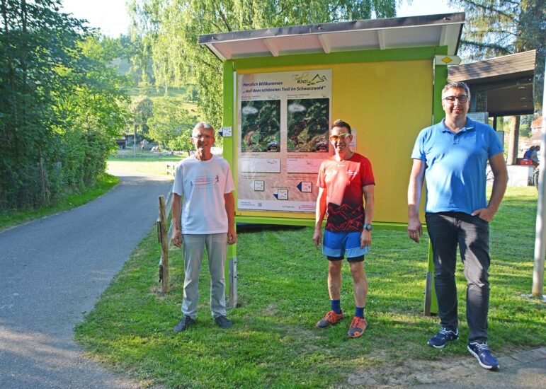 Der „TrailRun 21“ ist nun eine Dauereinrichtung für Laufbegeisterte. TVU-Vorstand Ludwig Börsig (links) und Ortsvorsteher Jürgen Isenmann (rechts) freuen sich über die Aufstellung einer neuen Trail-Infotafel beim Start und Ziel beim Heimatmuseum „Fürstenberger Hof“. Peter Schobert (Mitte) von der LG Brandenkopf hat die Strecke schon weit über einhundert Mal zurückgelegt, und bestätigt, dass der „TrailRun 21“ der schönste Trail im Schwarzwald ist. Foto: Hanspeter Schwendemann