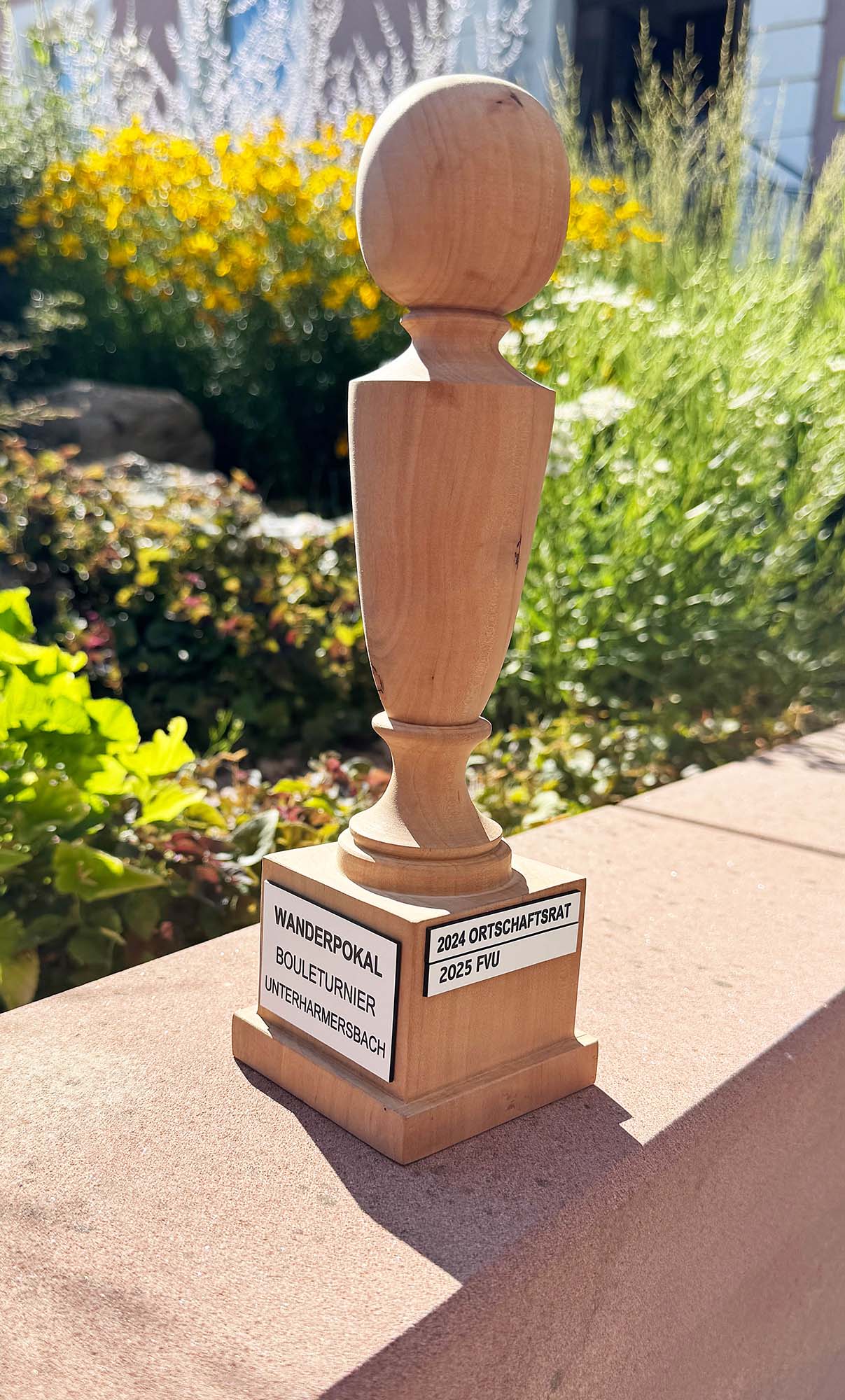 Der Wanderpokal des Hombacher Bouleturniers – frisch beschriftet und bereit, von Team zu Team zu wandern.