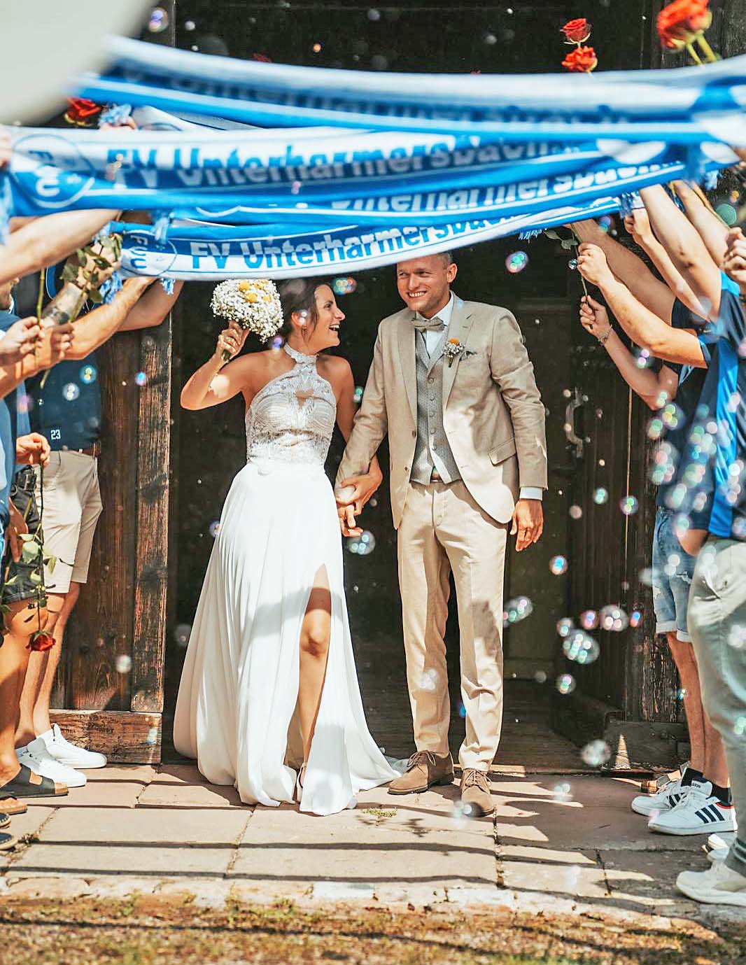 Nach dem überzeugend ausgesprochenen Ja-Wort erwartete das frisch vermählte Paar beim Spalier ein Farbenmeer aus blau-weißen FVU-Schals. Die FVU-Mitglieder mit dem Vorsitzenden Florian Jilg an der Spitze waren in großer Zahl erschienen, um die strahlenden Eheleute hochleben zu lassen und im Namen des Vereins ein Geschenk zu überreichen.