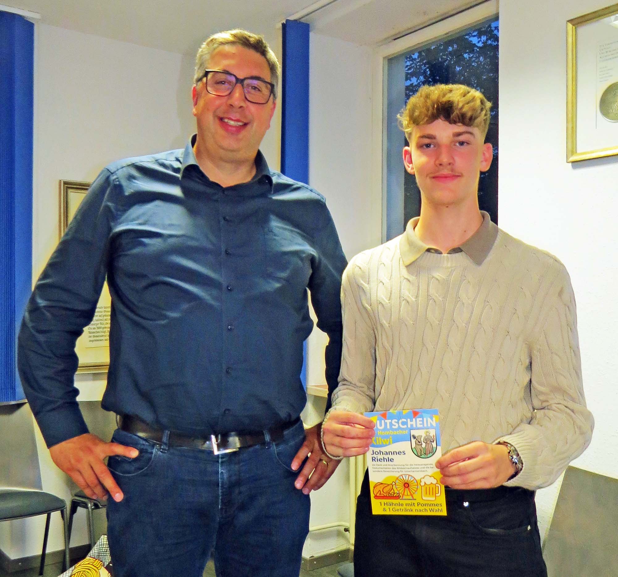 Johannes Riehle (Sohn der Schlosserei Riehle im Ort) hat beim Bildsteinwettbewerb mit seinem Aufsatz den 1. Preis gewonnen. Sein Thema `Wandel der Zeit in Unterharmersbach` hat er mit vielen Zeitzeugen und den Informationen seiner Oma ausführlich dargestellt. Jürgen Isenmann zeigte sich begeistert: “Das ist eine tolle Dokumentation über Unterharmersbach geworden.“ Das hat es bei dem Wettbewerb lange nicht mehr gegeben, dass so eine ausführliche Dokumentation über einen Ort geschrieben wurde, betonte Isenmann und überreichte dem Jugendlichen als Zeichen der Wertschätzung einen Kilwigutschein.