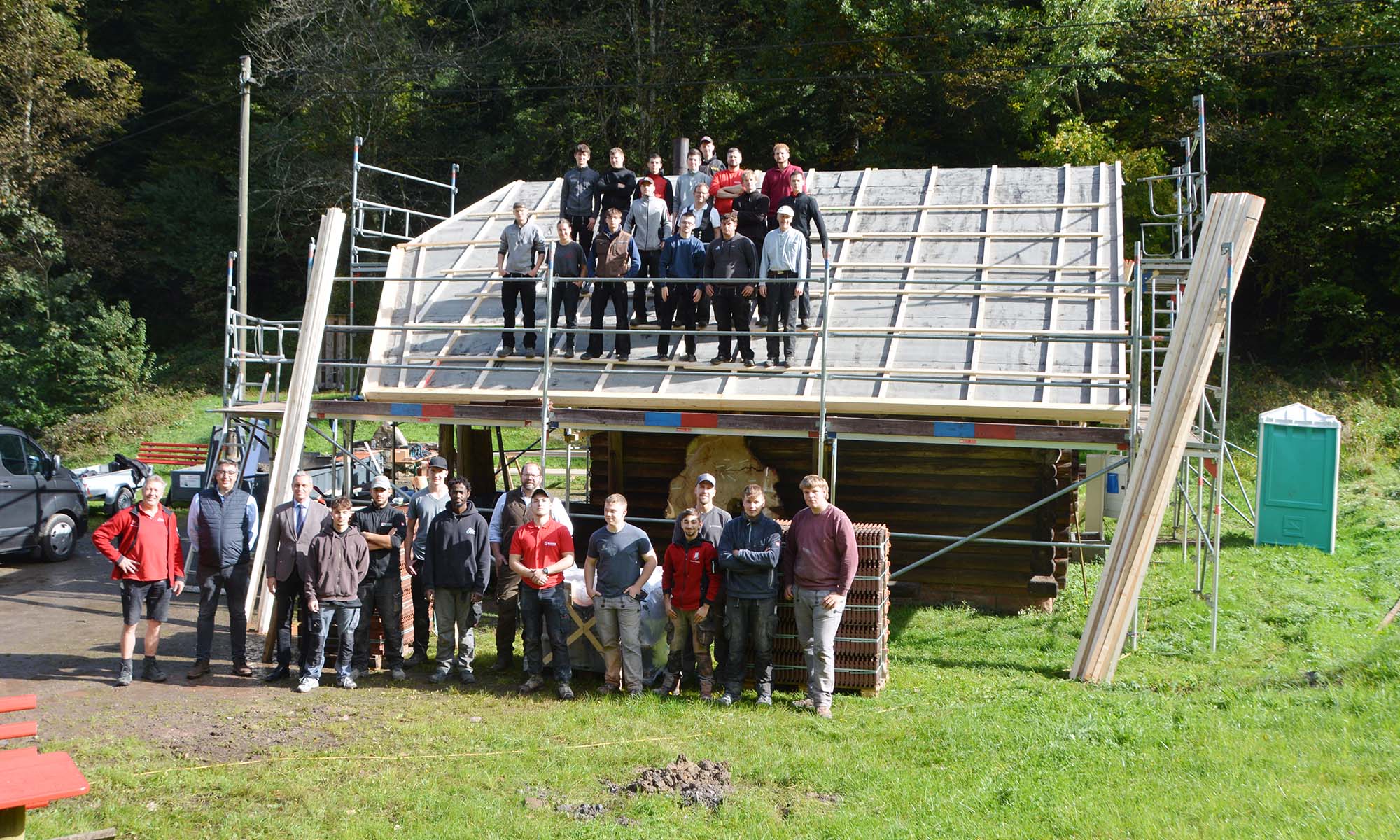Gewerbeschüler und Fachlehrer der Gewerbeschule Offenburg sanieren das Dach der Herrenholzhütte und zwei Grillstellen. Zimmerleute und Maurer im Einsatz.