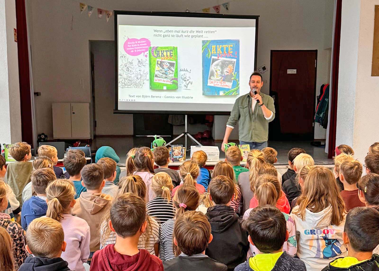 Von Beginn an zog der Autor die Kinder mit Humor, Authentizität und viel Herzblut in seinen Bann. Die Lesungen wurden zu echten Mitmach-Erlebnissen, die sicher lange in Erinnerung bleiben werden.
