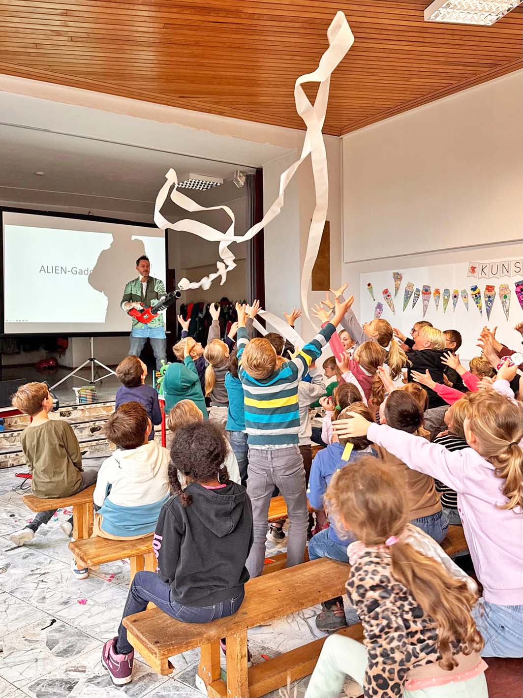 Für die dritten und vierten Klassen hatte Berenz ein weiteres Highlight vorbereitet: sein interaktives Buch „Explorer Team – Das Abenteuer beginnt!“ Die Idee dazu kam ihm übrigens bei einem Besuch im Schwarzwald. Das Buch funktioniert wie ein Escape Room zum Lesen – mit spannenden Rätseln, kniffligen Aufgaben und einer Menge Action. Auch hier nutzte der Autor seine „special effects“, sogar Papier-Schlangen, als Teil der Inszenierung, flatterten plötzlich durch die Aula.