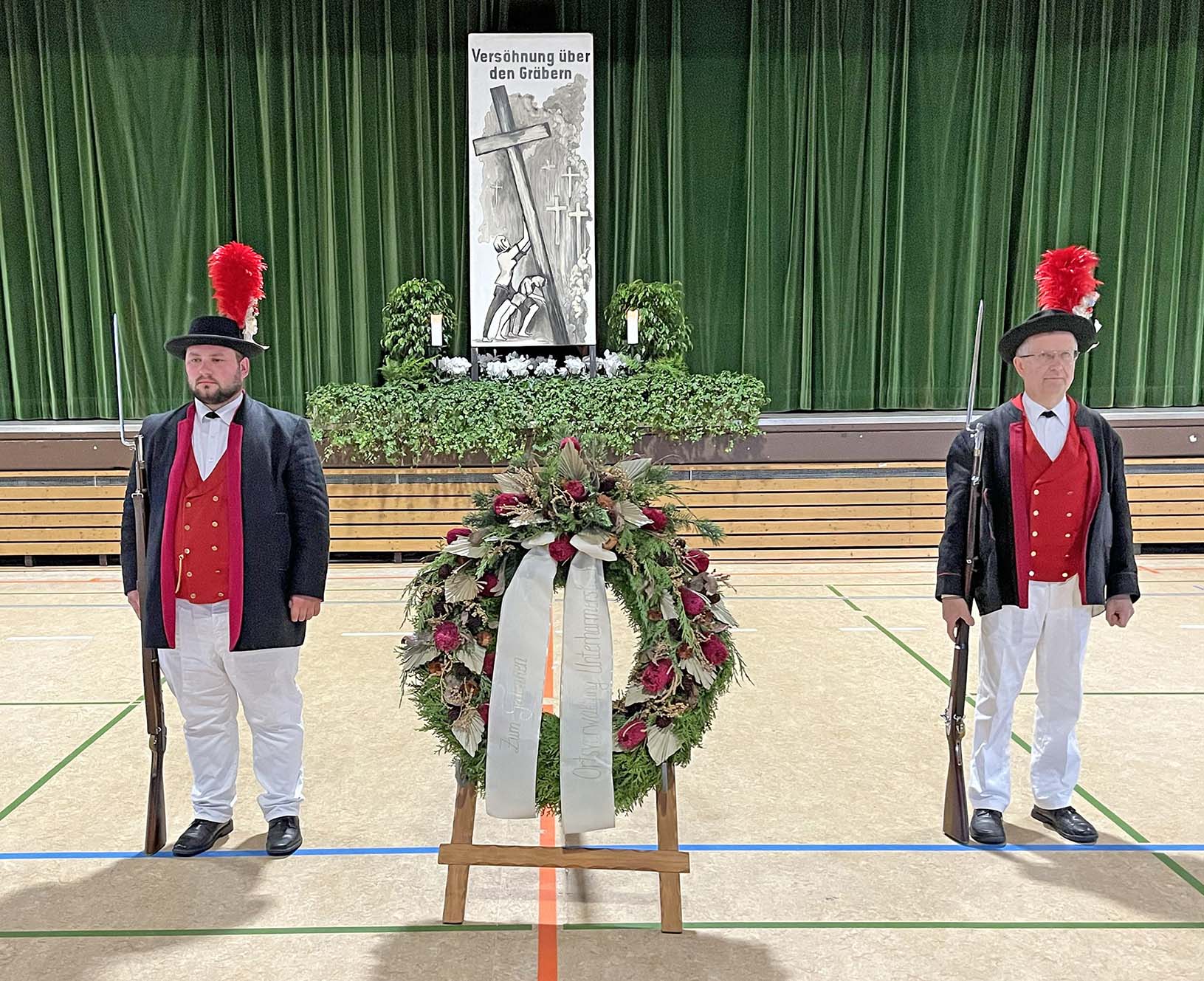 Der MGV Liederkranz intonierte gefühlvoll „Tebje Pojom“, ein bekanntes ukrainisches Friedenslied, sowie das beliebte Kirchenlied von Dietrich Bonhoeffer „Von guten Mächten“. Der Musikverein spielte „Ich hatt’ einen Kameraden“, und Ortschaftsrat Ewald Glatz sprach das Schlusswort. Anschließend erfolgten die feierliche Kranzniederlegung am Ehrenmal sowie ein Salutschießen der Bürgerwehr.