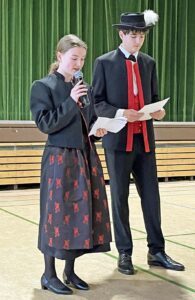 Nach Aufstellung der Fahnenwache, dem Einmarsch von Bürgerwehr und Feuerwehr sowie einem Choral der Musikkapelle wurde die Veranstaltung mit einem Redebeitrag von Emily Benz und Janis Lehmann eröffnet. In einem Dialog legten die beiden jungen Menschen dar, was Frieden und Erinnerung für sie bedeuten.
