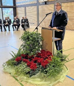 Jürgen Isenmann ging in seiner Ansprache auf die Menschen hinter den Namen auf der Ehrentafel ein. Menschen, die hier gelebt, gearbeitet, gehofft und geliebt haben – Vorfahren, Nachbarn und Freunde der Groß- und Urgroßeltern. Er erinnerte aber auch an jene, die aus vergangenen und aktuellen Kriegen zurückgekehrt sind, mit Narben an Seele und Körper, mit schmerzvollen Erinnerungen.