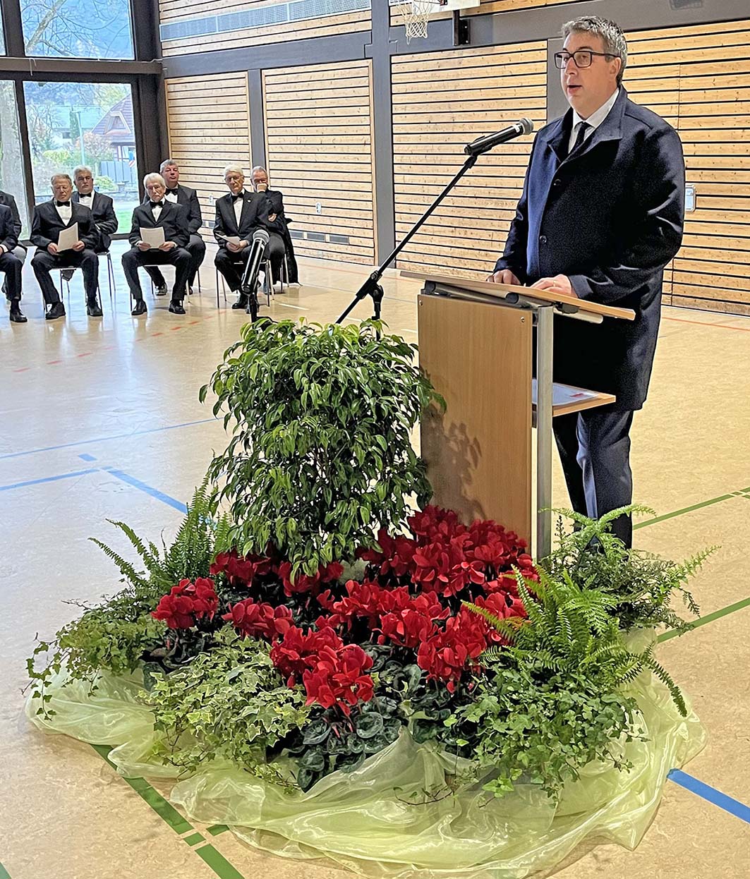 Foto: Michael HorstDie Bürgerwehr, der Männergesangsverein, der Musikverein, eine Fahnenabordnung der Feuerwehr sowie der Ortschaftsrat und die Ortsverwaltung Unterharmersbach mit Ortsvorsteher Jürgen Isenmann, die Altortsvorsteher Hans-Peter Wagner und Ludwig Schütze sowie viele Mitbürgerinnen und Mitbürger hatten sich vor und in der Schwarzwaldhalle versammelt, um der Gefallenen der Weltkriege zu gedenken. Die Halle war festlich geschmückt, und ein Kranz lag zur Niederlegung am nahegelegenen Ehrenmal bereit.