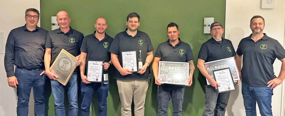 33 Jahre aktiv dabei ist Markus Armbruster, welcher hierfür mit einer Urkunde, einer Flasche Schnaps und einem gravierten Bierglas geehrt wurde.