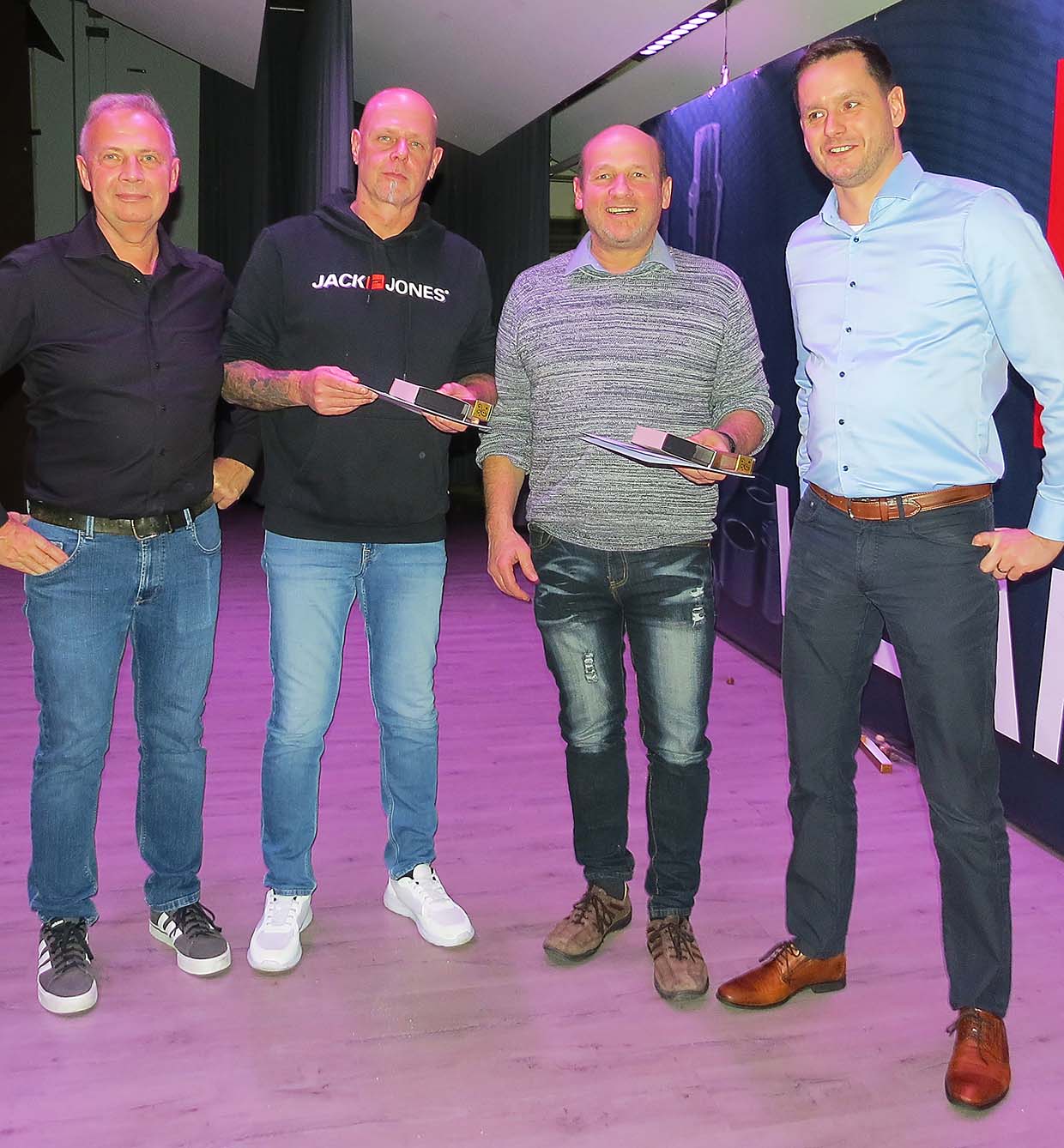 Die längste Treue zum Betrieb zeigten Herbert Isenmann und Wilhelm Benz: Mit 45 Jahren haben sie eine stolze Zahl erreicht. Werksleiter Christian Vollmer und Betriebsratsvor-