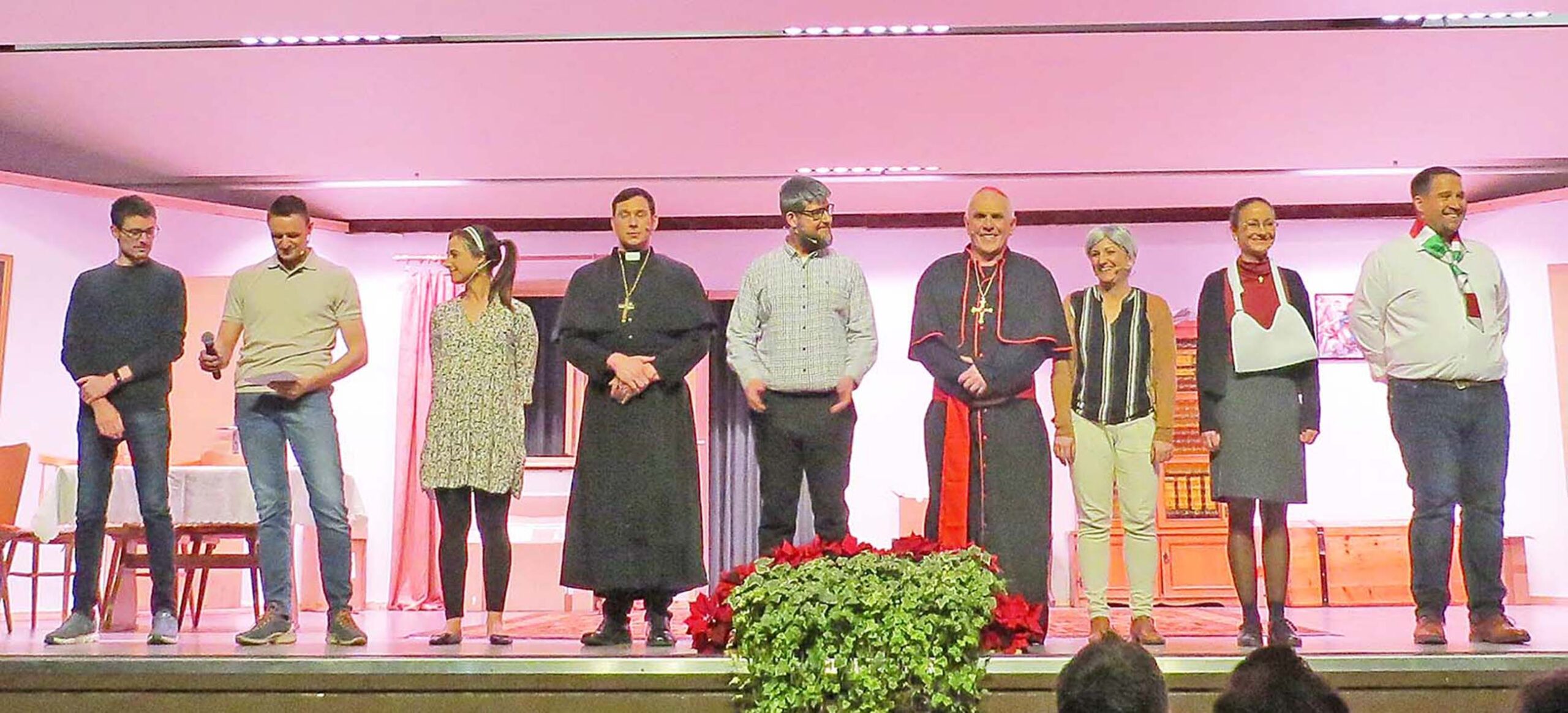 Pfarrer Schimmelmann wird von Manuel Heß dargestellt: Ruhig, besonnen und weise am Beginn des Abends; dann zunehmend verzweifelter wegen der desolaten Zustände in der Gemeinde.
