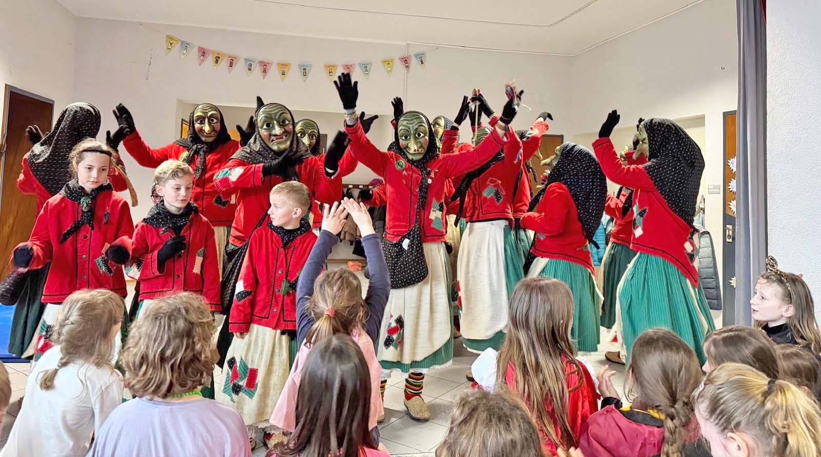 Foto: SchuleSchon Tage vor dem Schmutzigen Donnerstag war die Vorfreude bei den Kindern deutlich zu spüren. Ein Highlight war die närrische Unterrichtsstunde mit den Eckwaldhexen. Mit viel Einfühlungsvermögen stellten sie den Schülerinnen und Schülern ihr Häs vor und erklärten anschaulich die Masken sowie die dahinterstehenden Traditionen und Geschichten. Ziel war es, mögliche Ängste abzubauen und Verständnis für das Brauchtum zu schaffen. Auf kindgerechte und liebevolle Weise gelang es den Hexen, Vertrauen aufzubauen. Kinder, die anfangs noch zurückhaltend reagierten, zeigten sich am Ende neugierig und offen.