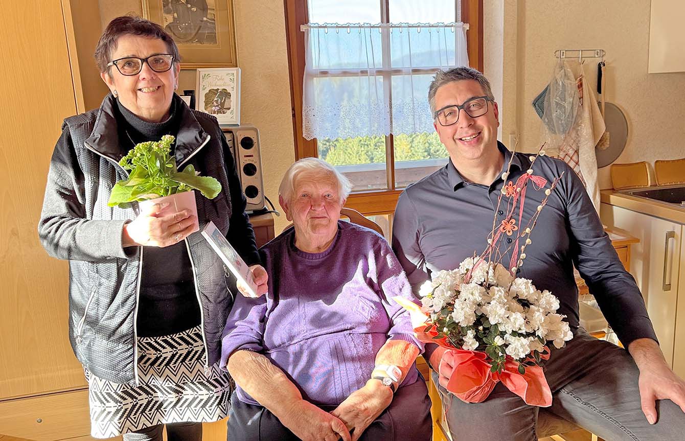Am 17. Februar konnte Agnes Lehmann ihren 90. Geburtstag feiern. In diesem Jahr fiel der Ehrentag mitten in die Fasnachtszeit, auf den Faschingsdienstag. Gefeiert wurde zunächst im kleinen Kreis mit der Familie. Die Glückwünsche der Gemeinde und der Kirchengemeinde folgten aufgrund der närrischen Zeit einige Tage später: Ortsvorsteher Jürgen Isenmann überbrachte sie letzte Woche persönlich, ebenso Brigitte Metzler im Namen der katholischen Kirchengemeinde.