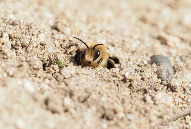 Wer weiß schon, dass rund 75 Prozent aller Wildbienenarten im Boden nisten? Zu den erdnistenden Bienen gehören zum Beispiel verschiedene Sandbienen, Furchenbienen, Schmalbienen oder Hummel-Arten. Dagegen können nur etwa 40 Wildbienenarten stehende Nisthilfen (auch Insektenhotels genannt) als Nistmöglichkeit nutzen.