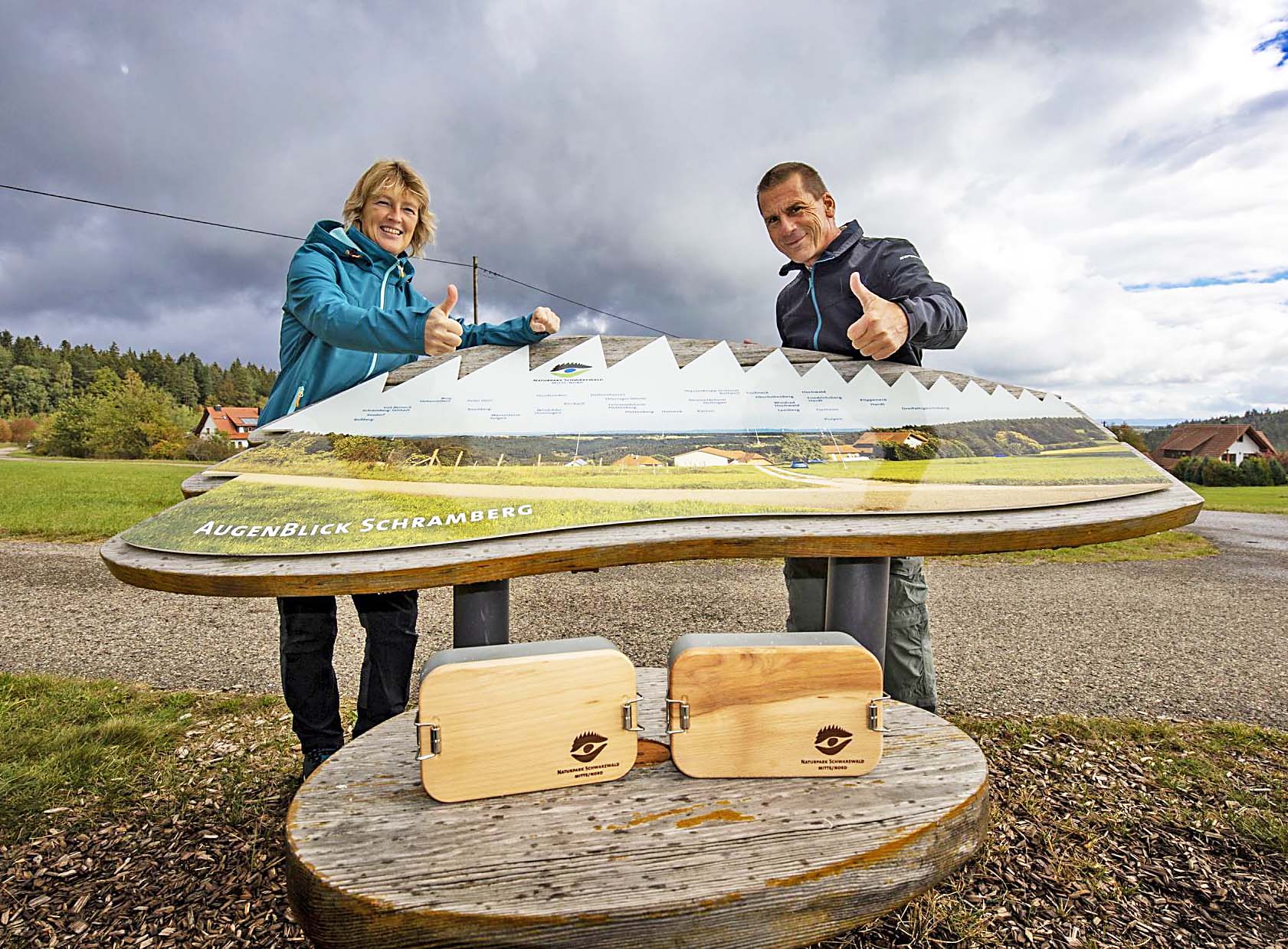 Mit Sitzbank, Tischchen und beschrifteter Panoramatafel eröffnen die AugenBlicke den Besucherinnen und Besuchern auf den Rundwanderwegen einen wunderschönen Ausblick in die Kultur- und Naturlandschaft des Naturparks. „Wir haben eine echte Fan-Gemeinschaft, die einen AugenBlick nach dem anderen erwandert“, berichtet Lilli Wahli. Sie ist die Projektmanagerin für die AugenBlicke beim Naturpark. Deshalb gibt es seit über einem Jahr auch eine Sammel- und Gewinn-Aktion: Wer zehn der über 30 AugenBlick-Runden erwandert hat, bekommt eine Naturpark-Vesperdose geschenkt.