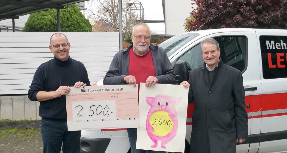 Dr. Wolfgang Stunder (rechts), Activity-Beauftragter des Lions-Clubs Kinzigtal und Fördervereinsvorsitzender Dr. Günther Haagen (Mitte) haben Helmut Walther vom Haslacher Club 82 aus den Erlösen des Weinstandes auf den Haslacher Märkten eine weitere Spende über 2.500 Euro überreicht.