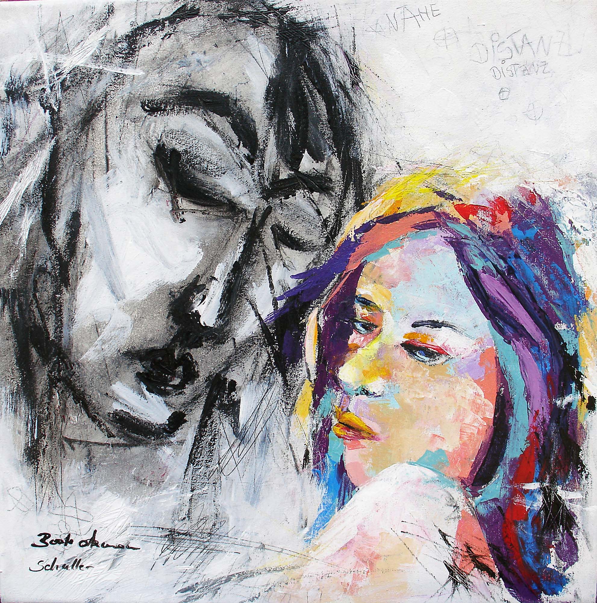 Die Künstlerinnen haben diesen Impuls von außen auf gegriffen und ihr neues Kunstprojekt „Nähe und Distanz“ in Gang gesetzt. Um kooperativ/konstant an ihrem Projekt und den Werken zu arbeiten, finden dazu regelmäßige Arbeitstreffen statt. Das Konzept „Nähe und Distanz“ macht auch die konträren Arbeitsweisen der beiden sichtbar. Gabriele Schuller arbeitet vorwiegend strukturiert und gegenständlich. Sie hat vor allem den Menschen in der Gesellschaft im Fokus. Eine abgehalfterte Litfaßsäule bildet das Ausgangsmaterial für ihre farbintensiven Arbeiten. Beate Axmanns künstlerische Ausdrucksweise ist intuitiv, expressiv und themenbezogen. Ihre Arbeiten entstehen meistens in Serien, wie zum Beispiel ihre themenübergreifende Serie „Sichtverrückt“. Seit drei Jahren legt sie ihren Schwerpunkt auf schwarz-weiß.