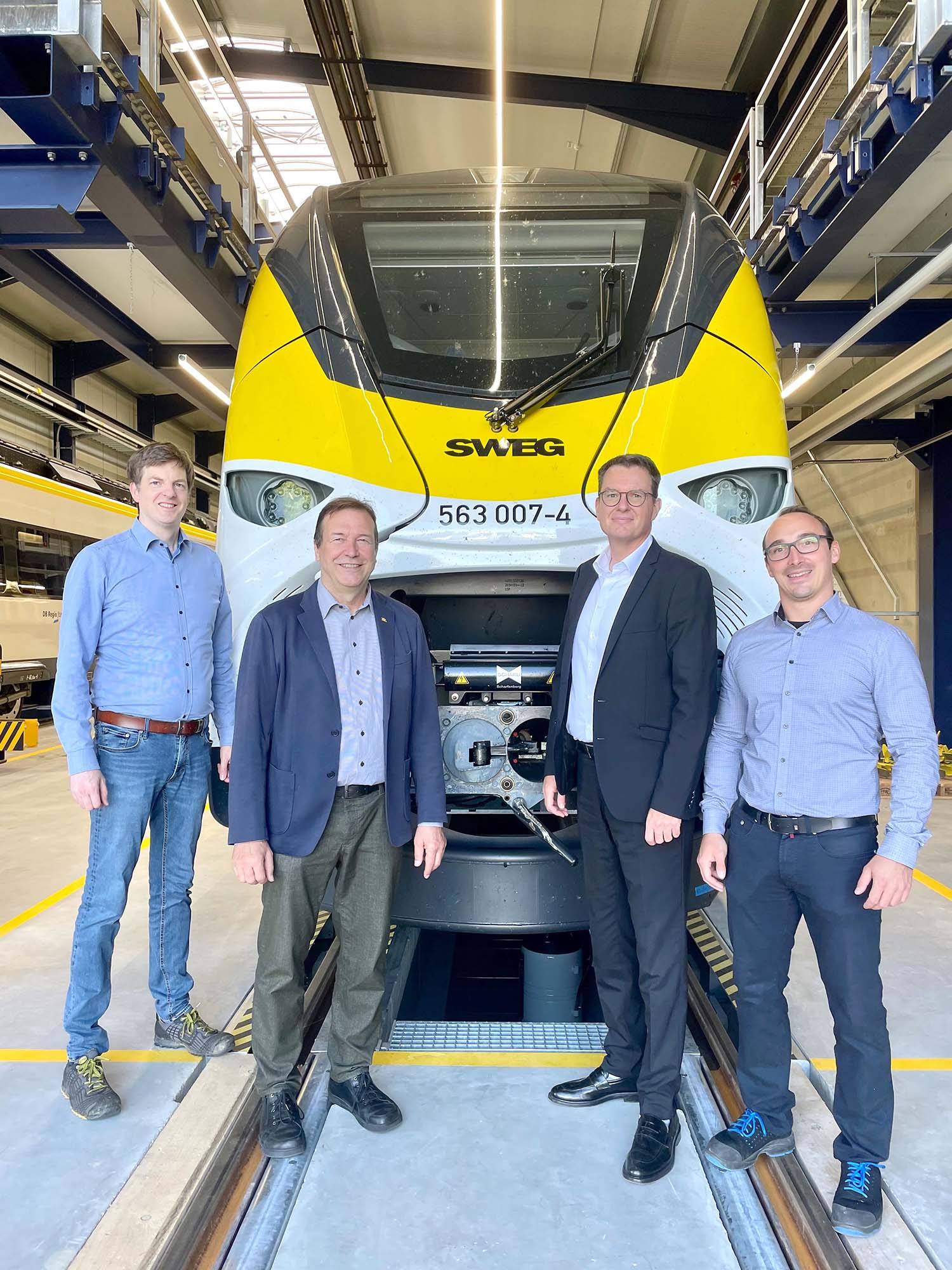 Landtagsabgeordneter Thomas Marwein besichtigte gemeinsam mit Tobias Harms (Vorsitzender der SWEG-Geschäftsführung), Timo Jung (Fachbereichsleiter Fahrzeuge/Werkstätten Eisenbahn) und André Sorgius (Mitarbeiter im Bereich Fahrzeuge/Werkstätten Eisenbahn) das neu erbaute Bahnbetriebswerk in Offenburg, indem künftig auf rund 1400 Quadratmetern Batteriezüge instand gesetzt werden.