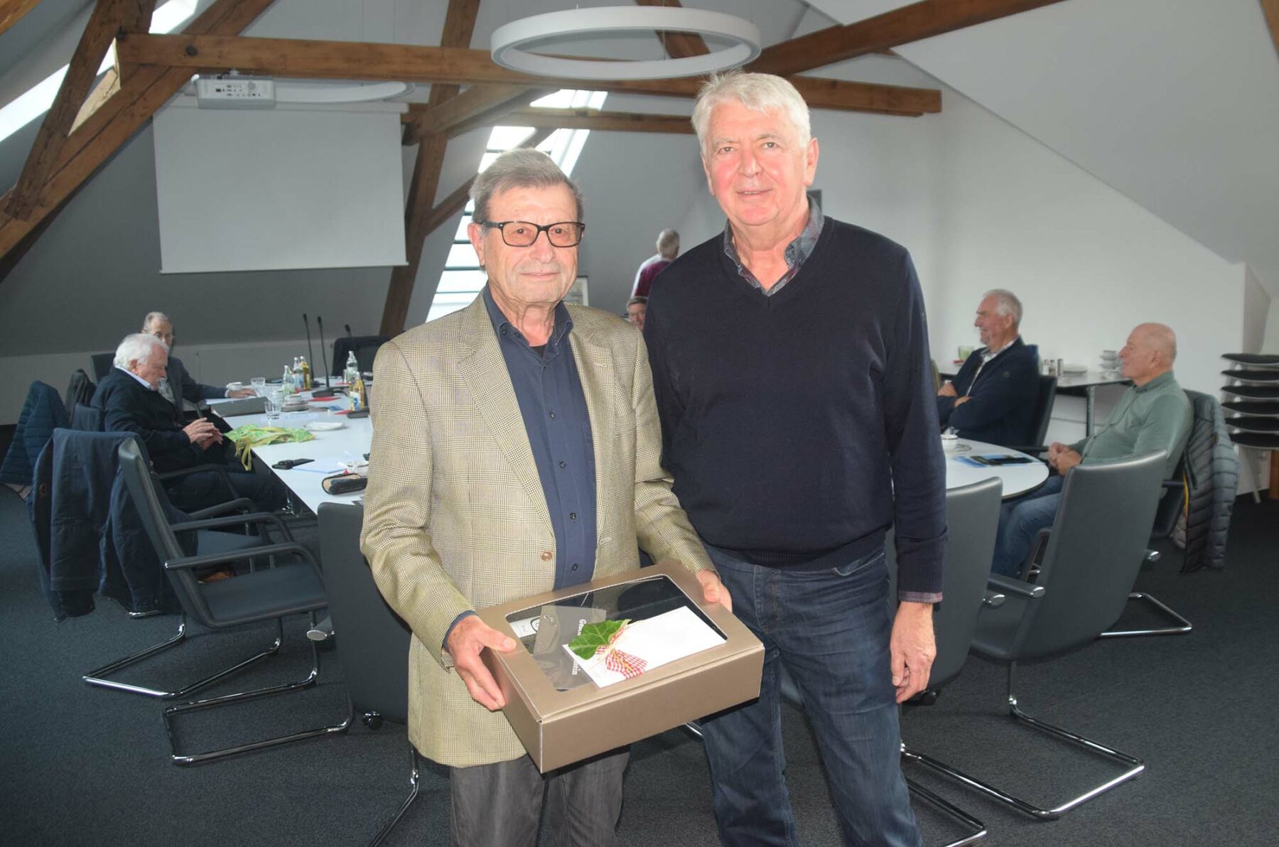 Organisator Otmar Ritter dankte Bürgermeister Nicolai Bischler für den Empfang. Danach teilte er den Kollegen mit, dass er in den zurückliegenden 17 Jahren 34 Treffen mit großer Freude organisiert und geleitet habe. Nun sei aber die Zeit gekommen, dieses Amt in jüngere Hände zu legen. Siegfried Scheffold, ehemaliger Bürgermeister in Hornberg, hatte sich bereit erklärt, seine Nachfolge anzutreten. Scheffold dankte Otmar Ritter für sein großes Engagement, diesen kommunalpolitischen Austausch mit einem Begleitprogramm für die Ruheständler zu organisieren. Er überreichte ein Weinpräsent und einen Gutschein als sichtbares Zeichen des Dankes.