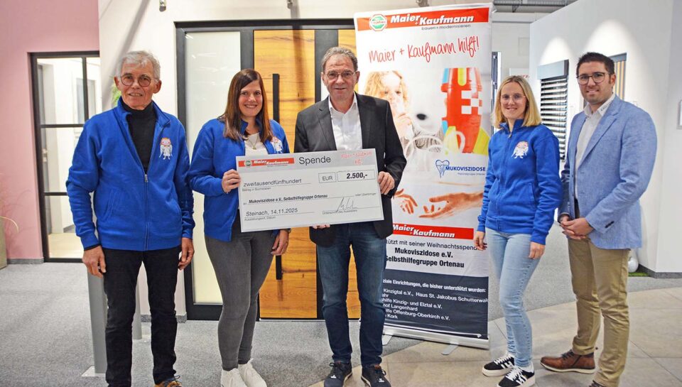 „Von der Region für die Region“ hat sich die Firma Maier + Kaufmann mit ihren Niederlassungen in Steinach, Offenburg und Lahr auf die Fahne geschrieben. Dies gilt nicht nur für den Handel mit Baustoffen sondern auch für ihre Weihnachtsaktion. In diesem Jahr hat das Unternehmen eine Spende in Höhe von 2500 Euro an die Selbsthilfegruppe Mukoviszidose Ortenau übergeben.