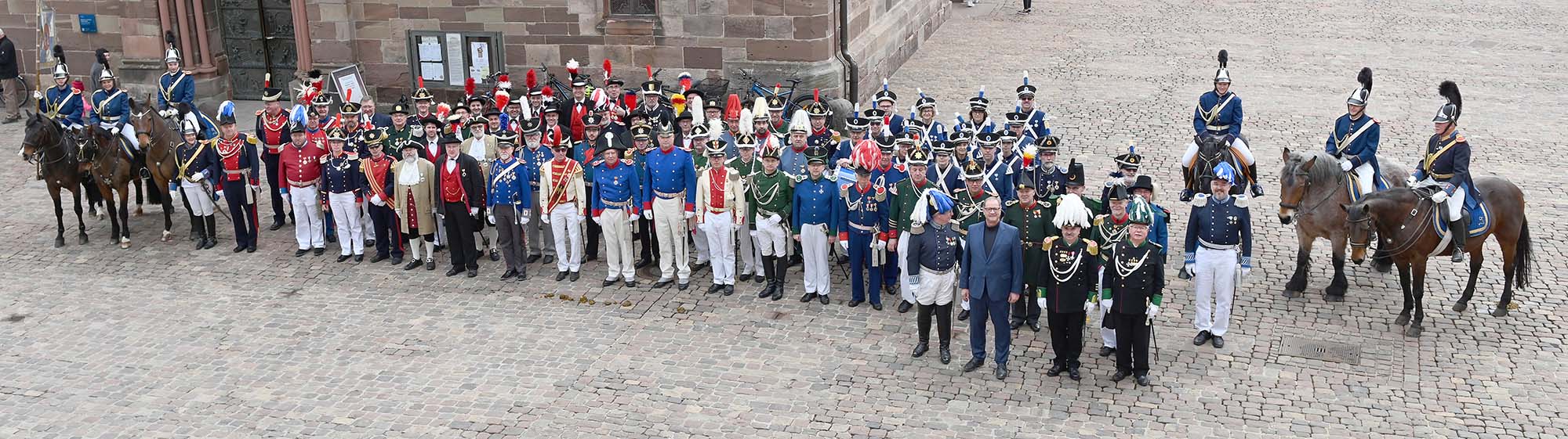 Mehr als sechzig Kommandanten und Spielmannszugführer des Landesverbandes Baden-Südhessen haben sich in ihren prächtigen Uniformen in Villingen zu ihrer jährlichen Tagung versammelt. Dem Verband sind 22 historische Bürgerwehren und Garden, vom Bodensee bis zur Bergstraße, mit über 1.200 Mitgliedern angeschlossen.